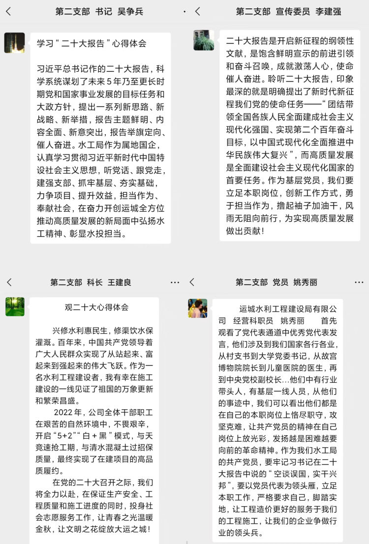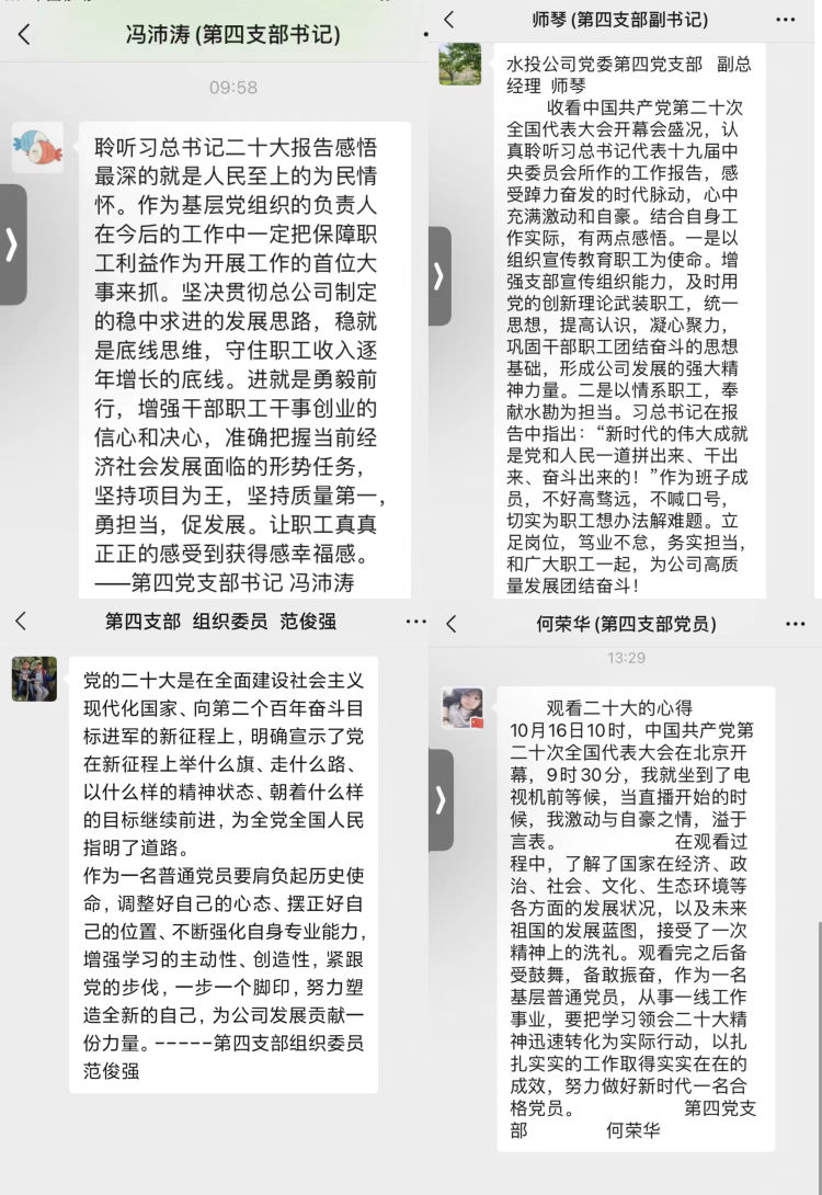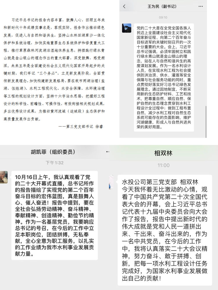 習近平總書記的報告中指明了生態(tài)文明建設的重要意義,特別強調(diào)了要“推動綠色發(fā)展,促進人與自然和諧共生”,令人振奮、催人奮進,大家紛紛感言,要把黨的二十大精神作為當前和今后一項重要政治任務,要學以致用,立足本職崗位,突出工作重點,用黨的二十大精神指導實踐,做好中心城區(qū)重點水系項目推進工作,推進黑臭水體治理,強化水質(zhì)提升,解決城區(qū)排澇問題,把黨的二十大精神轉(zhuǎn)化為推進公司發(fā)展的強大動力和生動實踐,努力在新時代新征程上展現(xiàn)新氣象新作為。