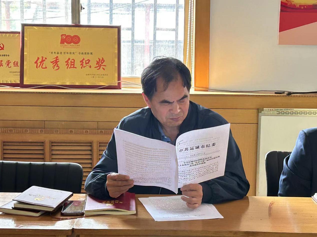 為繼續(xù)加強黨員領導干部黨風廉政建設,嚴明紀律規(guī)矩,支部紀檢委員狄紅革同志傳達了《 中共運城市紀律檢查委員會關于8起黨員干部“吃拿卡要”破壞營商環(huán)境典型案件的通報》。