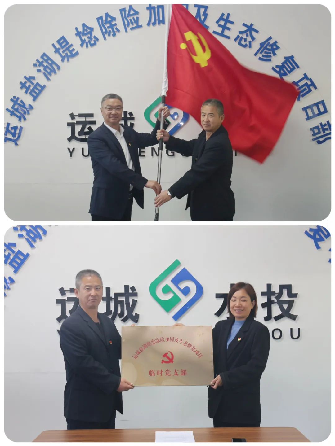 會議首先宣讀了公司黨委《關(guān)于同意成立運城鹽湖堤埝除險加固及生態(tài)修復(fù)項目臨時黨支部的批復(fù)》,黨委書記、副書記分別向臨時黨支部授旗、授牌,贈送了黨章、黨徽、黨建圖書、會議記錄本、學(xué)習(xí)資料等,并對鹽湖項目臨時黨支部的成立表示熱烈祝賀。