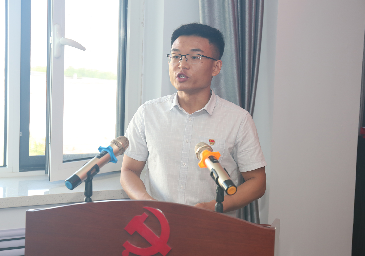 大會在雄壯的國歌聲中拉開帷幕,黨委辦公室主任郝麗娜同志領誓,全體黨員面對黨旗,共同重溫了入黨誓詞。