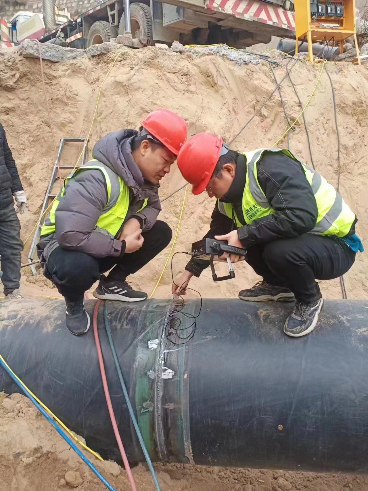 技術(shù)人員頂寒風深入河津市5號排水渠項目建設(shè)區(qū)域進行細致踏勘作業(yè)